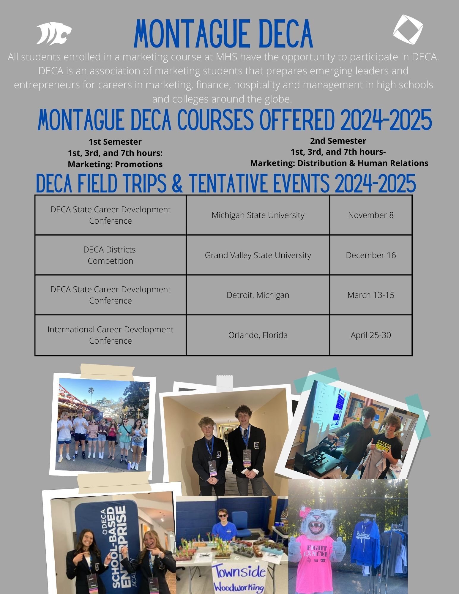 All students enrolled in a marketing course at MHS have the opportunity to participate in DECA. DECA is an association of marketing students that prepares emerging leaders and entrepreneurs for careers in marketing, finance, hospitality and management in high schools and colleges around the globe. Students in Montague DECA have various leadership field trips as well as the opportunity to compete with students from around the state and world at DECA competitions. You can learn more about DECA at mideca.org and deca.org.